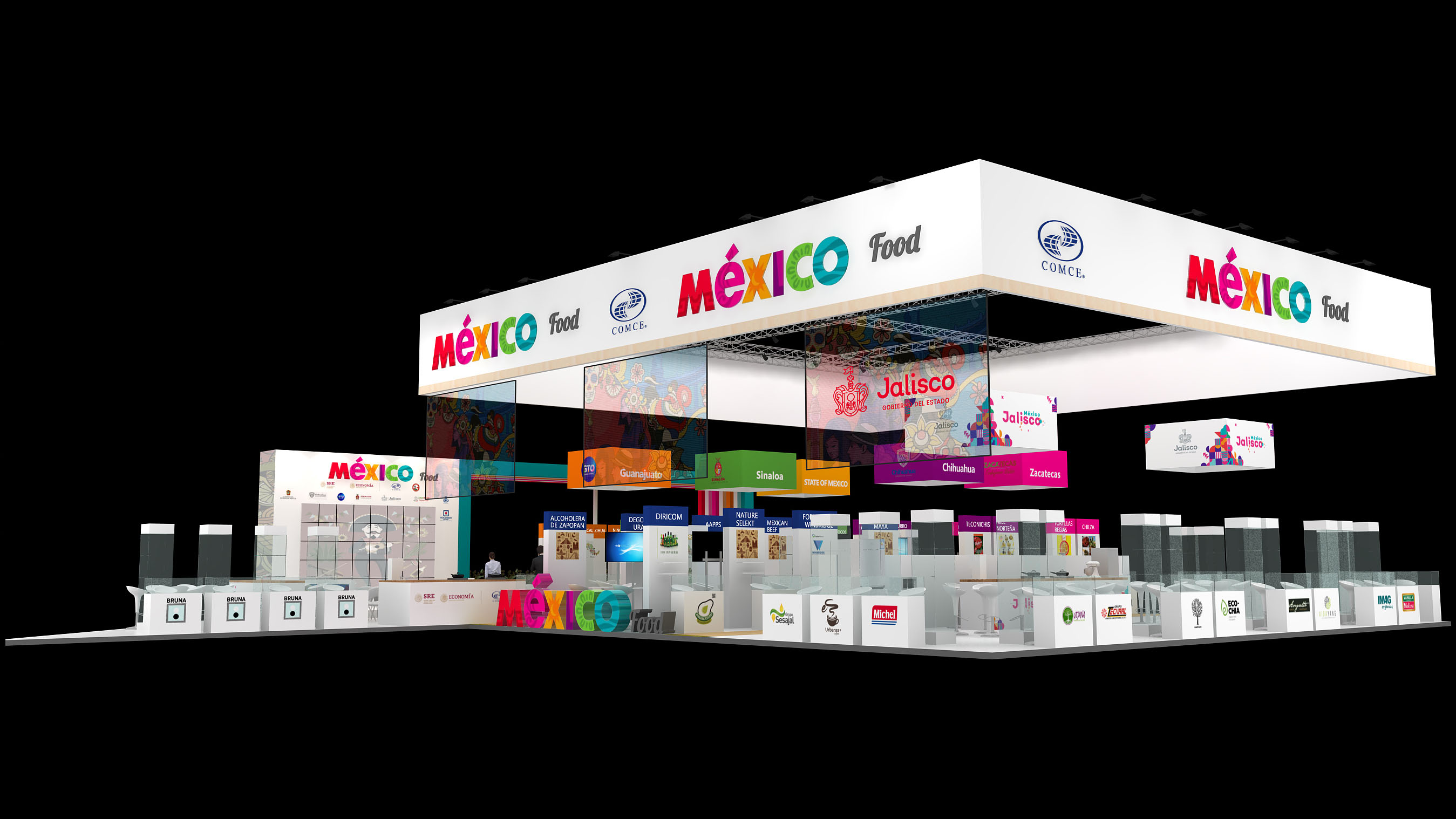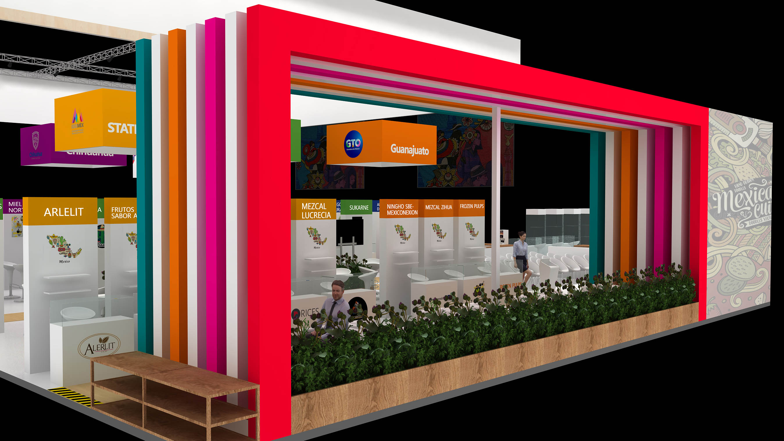 墨西哥展臺設(shè)計(jì)為四面開放,鼓勵參觀者更自由的進(jìn)出,整個(gè)展臺由450平米組成,功能區(qū)上分為3大展區(qū);其中100平米的農(nóng)產(chǎn)品展區(qū);250平方米的食品展區(qū)和100平米的公共活動展區(qū)。農(nóng)產(chǎn)品展區(qū)和食品展區(qū)共計(jì)48家參展企業(yè)均設(shè)有獨(dú)立的展覽區(qū)域(帶有儲物功能的咨詢桌,宣傳海報(bào),資料架,部分玻璃展柜)。每個(gè)區(qū)域滿足所屬產(chǎn)業(yè)領(lǐng)域的參展企業(yè),用來展示展品或者形象,讓觀眾能夠很明顯的區(qū)分出墨西哥在各個(gè)產(chǎn)業(yè)領(lǐng)域的展出內(nèi)容,將墨西哥的精彩與世界共享。