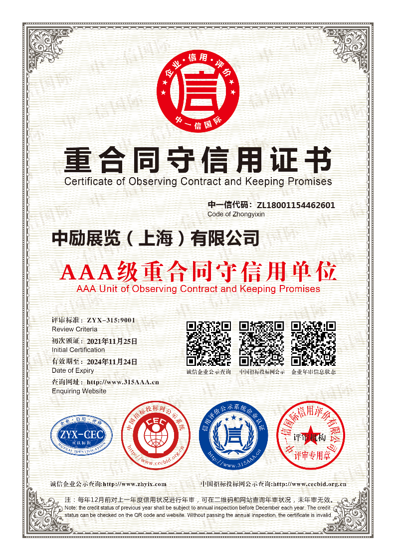 我們還獲得了來自進(jìn)博局的感謝信、AAA級誠信供應(yīng)商、AAA級重質(zhì)量守信用等級證書、ISO9001質(zhì)量管理體系認(rèn)證、ISO14001環(huán)境管理體系認(rèn)證、展陳工程設(shè)計(jì)與施工一體化壹級資質(zhì)證書、鄉(xiāng)村振興建設(shè)委員會會員單位、中國會展產(chǎn)業(yè)金手指獎-十大創(chuàng)新設(shè)計(jì)機(jī)構(gòu)獎等殊榮,進(jìn)一步彰顯了我們在追求卓越、成為值得信賴的展覽展示綜合服務(wù)商方面所獲得的成就。