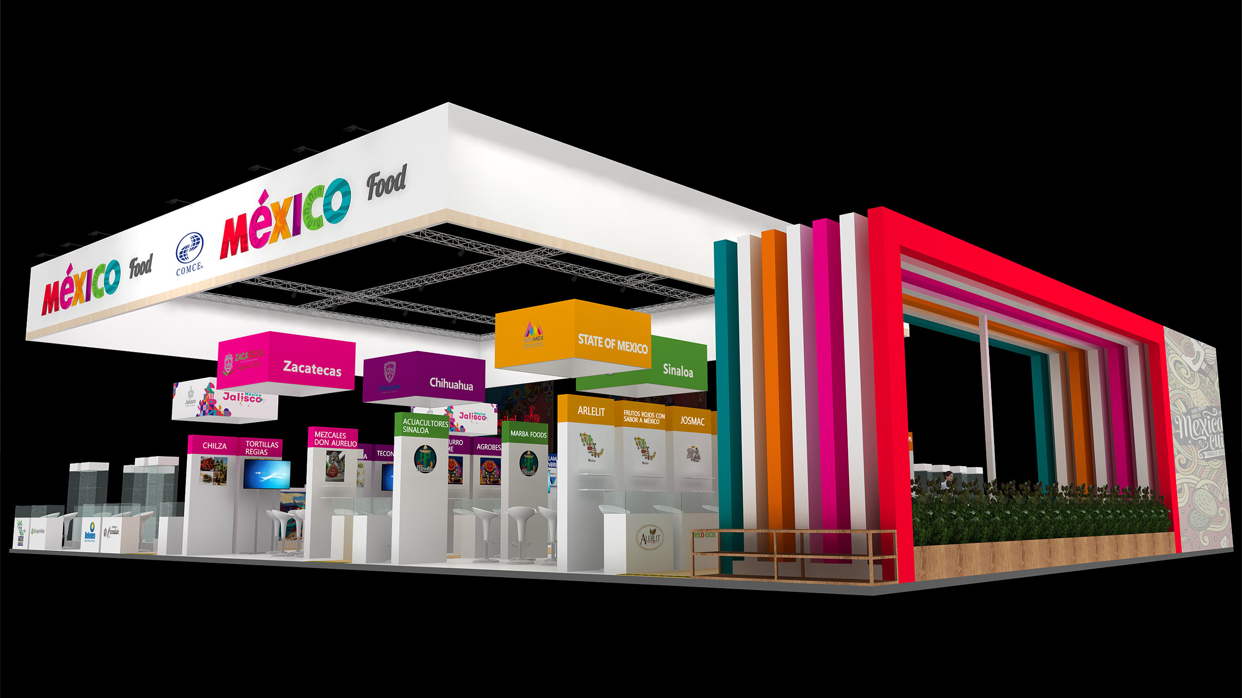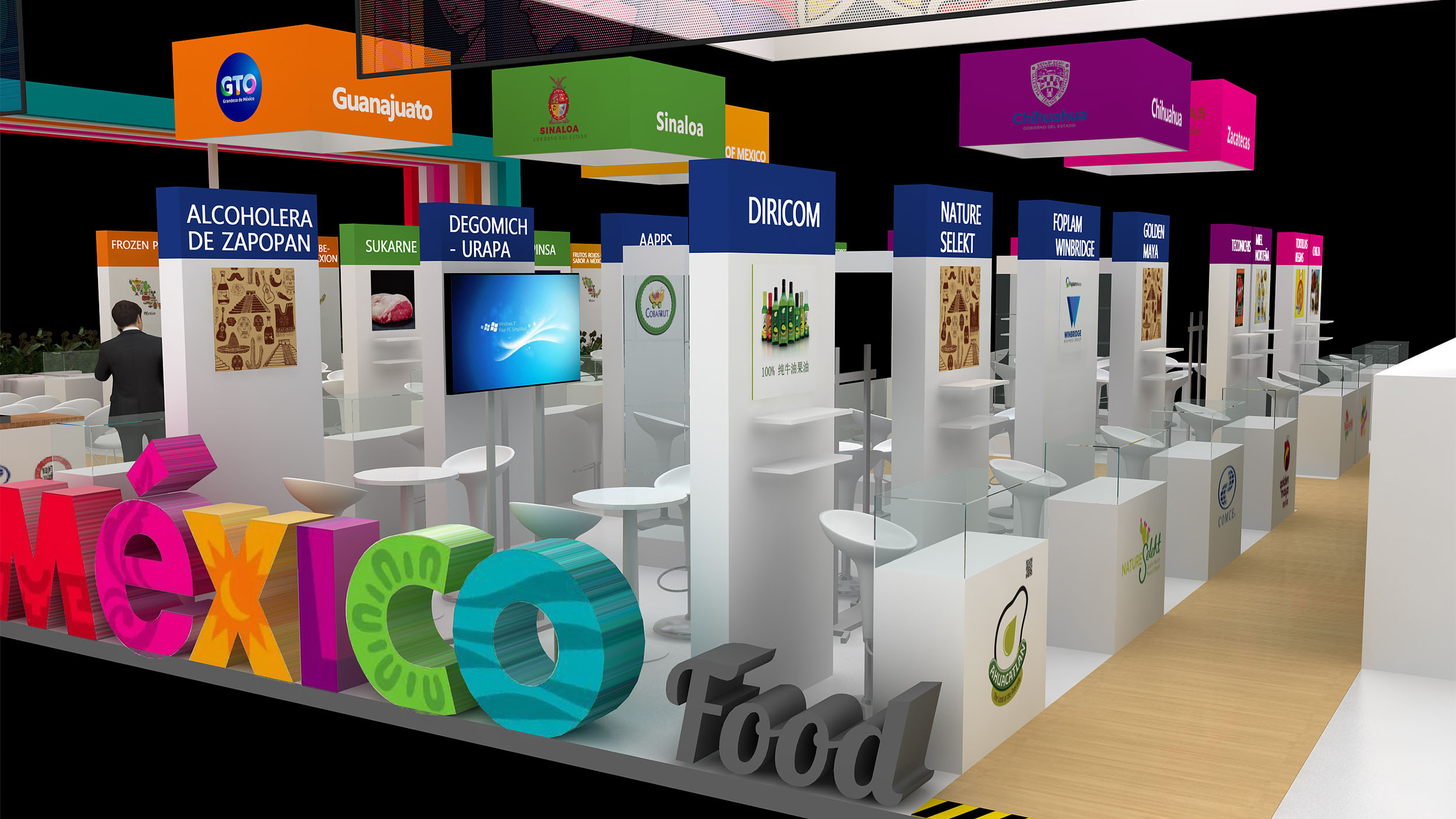墨西哥展臺設(shè)計(jì)為四面開放,鼓勵參觀者更自由的進(jìn)出,整個(gè)展臺由450平米組成,功能區(qū)上分為3大展區(qū);其中100平米的農(nóng)產(chǎn)品展區(qū);250平方米的食品展區(qū)和100平米的公共活動展區(qū)。農(nóng)產(chǎn)品展區(qū)和食品展區(qū)共計(jì)48家參展企業(yè)均設(shè)有獨(dú)立的展覽區(qū)域(帶有儲物功能的咨詢桌,宣傳海報(bào),資料架,部分玻璃展柜)。每個(gè)區(qū)域滿足所屬產(chǎn)業(yè)領(lǐng)域的參展企業(yè),用來展示展品或者形象,讓觀眾能夠很明顯的區(qū)分出墨西哥在各個(gè)產(chǎn)業(yè)領(lǐng)域的展出內(nèi)容,將墨西哥的精彩與世界共享。